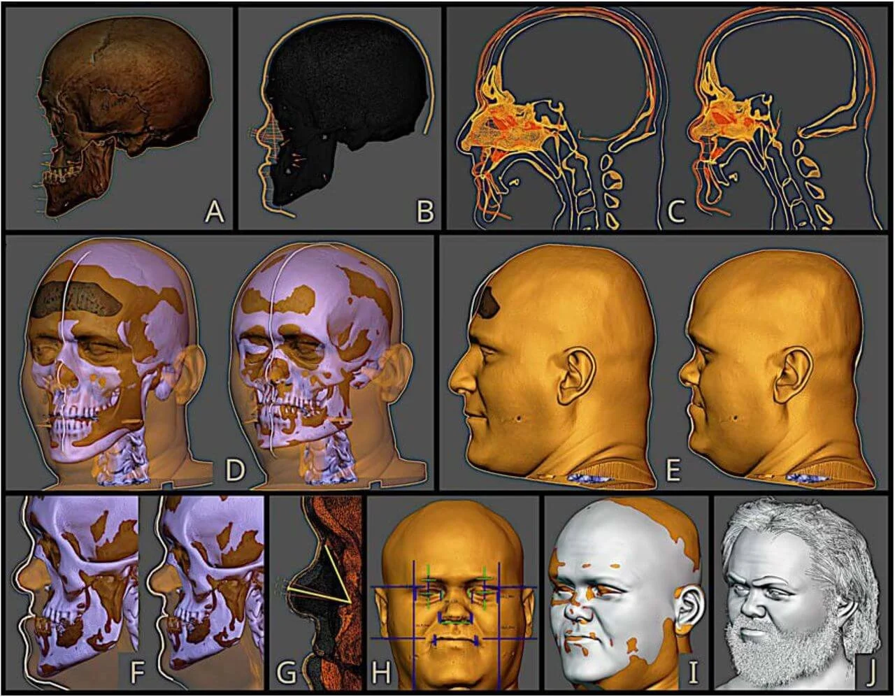 These markers served as a guide for the facial reconstruction process. The nose projection, in particular, presented challenges due to variations in available methods. However, through anatomical deformation techniques and comparisons with computed tomography (CT) data, a plausible nose projection was achieved.